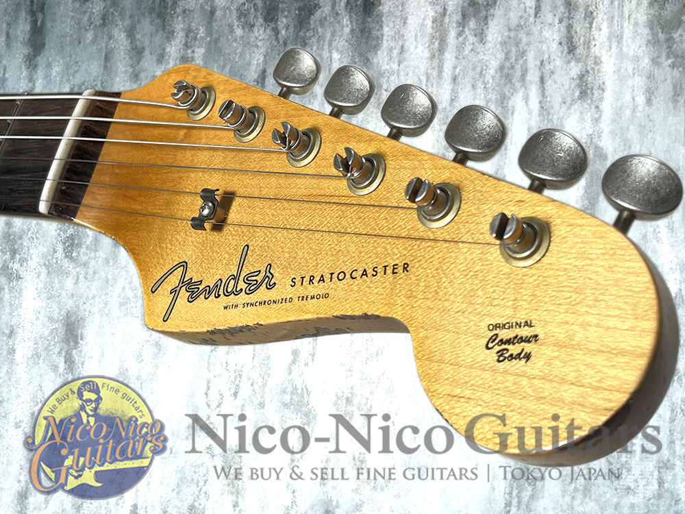 スラブ貼り指板の1959年製ストラトキャスターを復刻しており、大胆に剥がされたネックグリップやボディバックの塗装、細かく入れられたウェザーチェックやボディエッジの打ち傷、金属パーツのくすみ、エルボーの露出した下地のゴールド/ホワイト層など、長年に渡り弾き込まれた風合いが大胆なレリック加工により再現された抜群のルックスです。