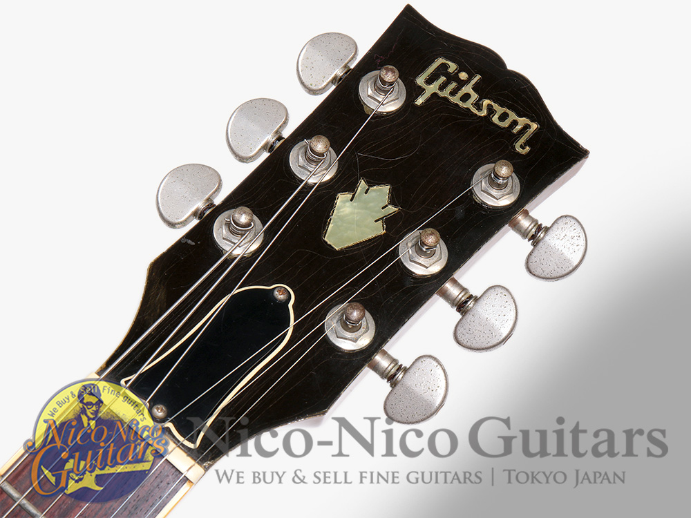 ボディ全体に多数の打痕と擦れ傷、ボディトップとヘッド全体にウェザーチェック、リアトーンノブ付近に塗装の剥がれを伴う打ち傷、ボディバックにバックル痕、ネック裏に多数の浅い凹みキズとポツキズ、ヘッド外周に塗装の傷み、指板サイドバインディング上18F付近に塗装の欠けを伴う打痕、ピックガードにスクラッチ、全体に色灼け、金属パーツにくすみと若干の腐食がございます。