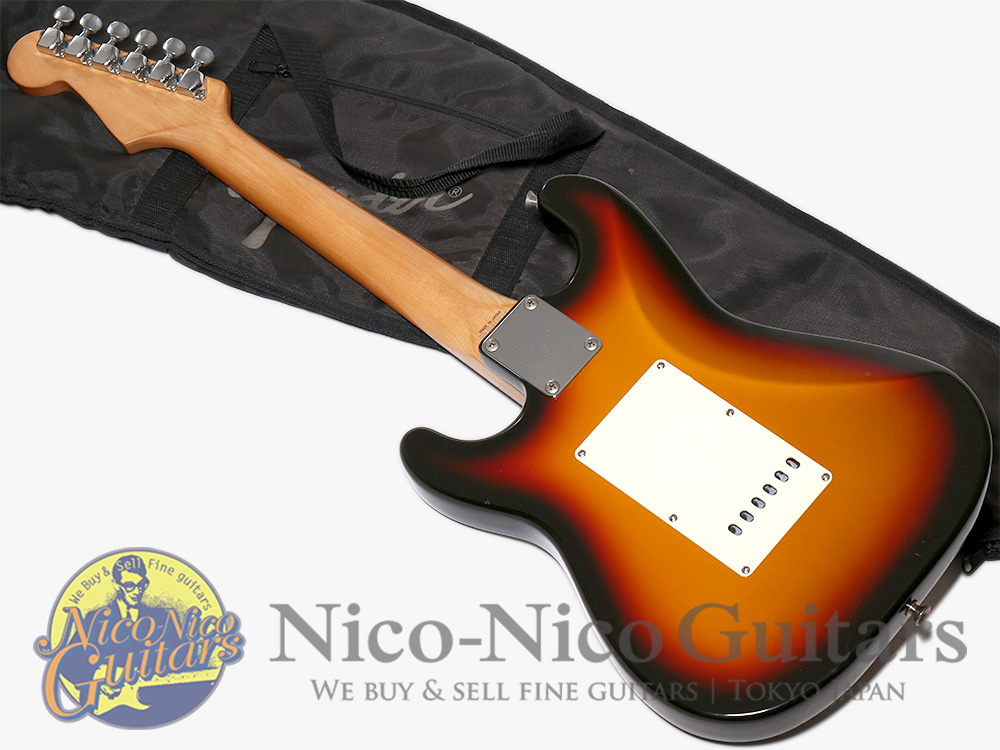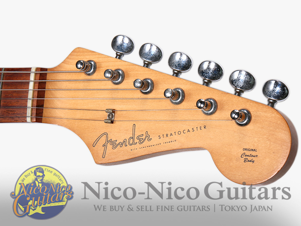 ボディ全体に複数の擦れ傷と浅い打痕、ネック裏に複数の浅い凹み傷と打痕、ヘッドの外周に複数の浅い打ち傷、全体に色灼け、金属パーツにくすみと若干の腐食がございます。